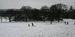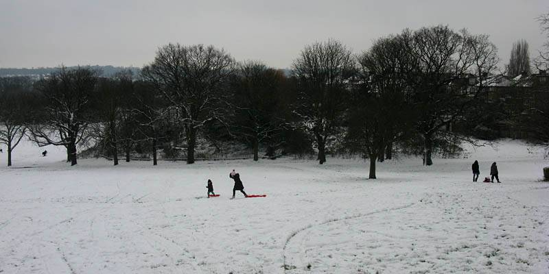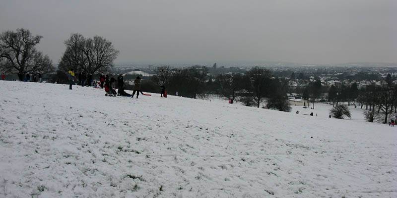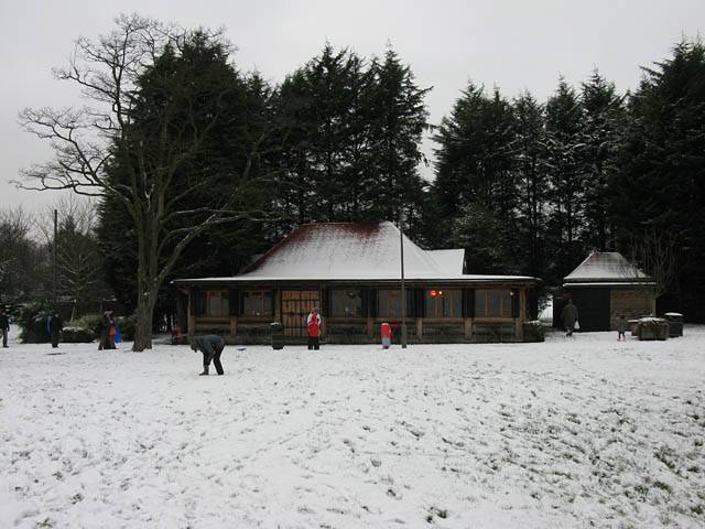 Sledgers on the slopes of Sunny Hill Park. | Sunny Hill Park Café. | Panorama of sledgers on the slopes of Sunny Hill Park from below. | Snow covered branches. |