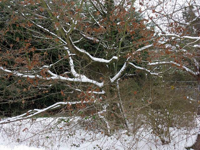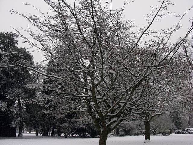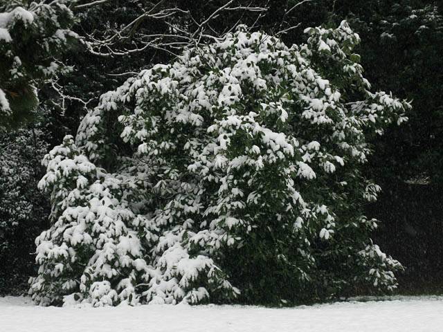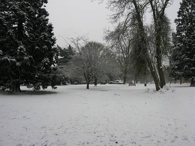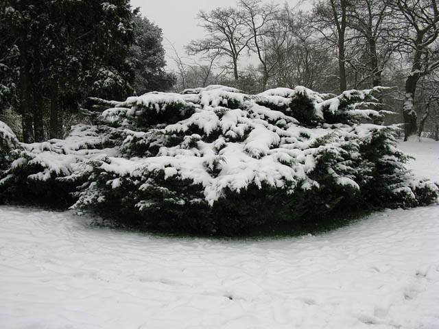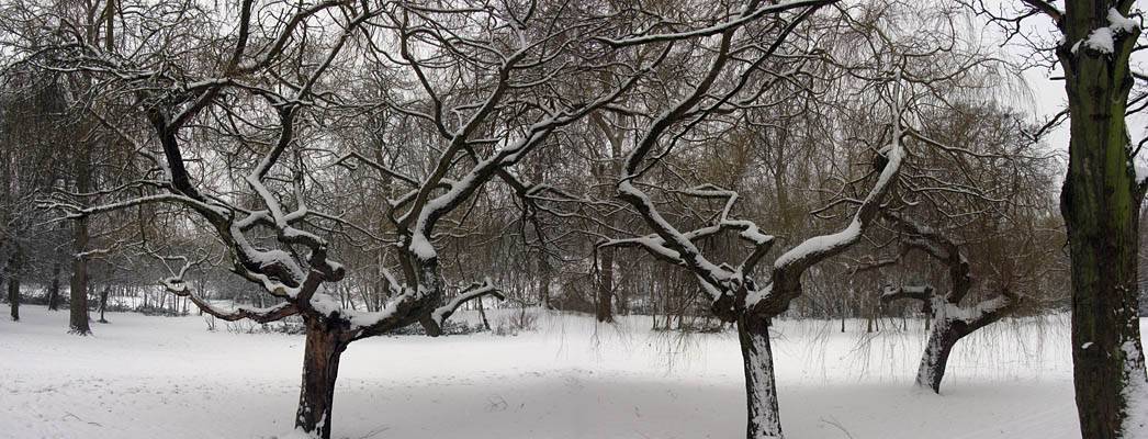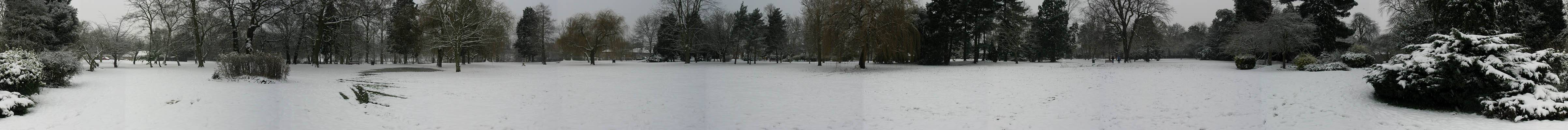 Another snowscape. | Snow covered foliage. | Snow hilighting tree branches. | Zoom panorama looking NNW from the Southern end of the park towards M1J2. |