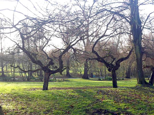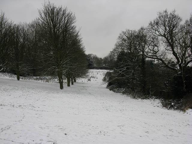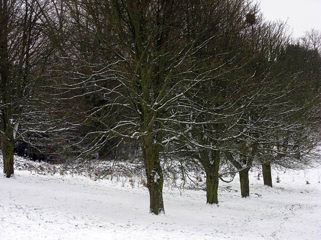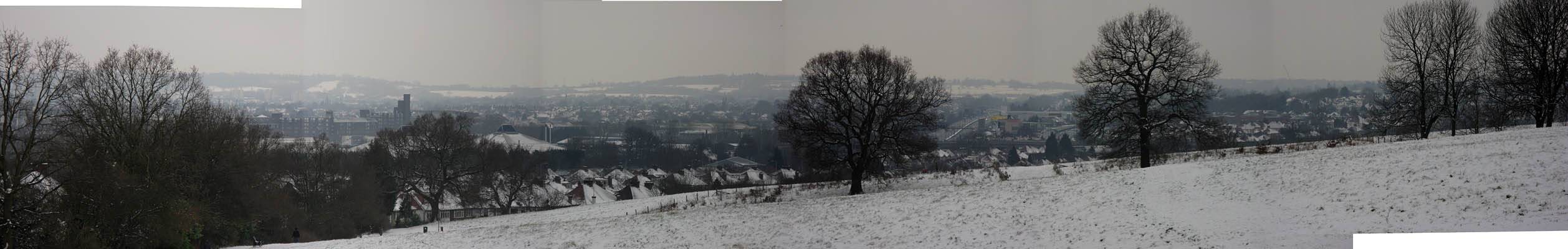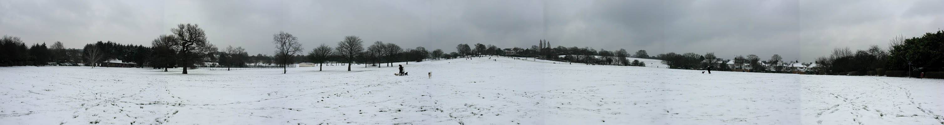 Another snowscape. | Snow covered foliage. | Snow hilighting tree branches. | Zoom panorama looking NNW from the Southern end of the park towards M1J2. |