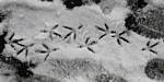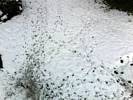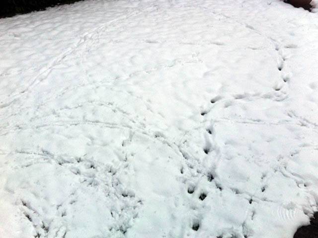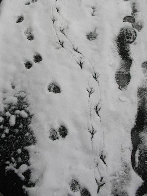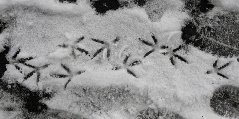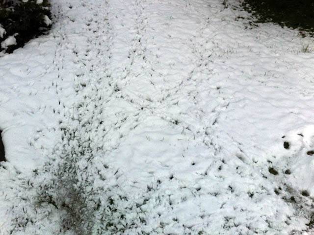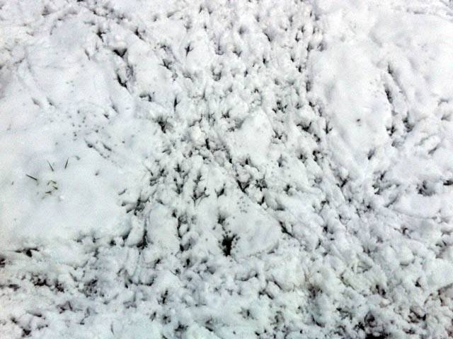 Extensive bird tracks (plus a cat track) in the snow under the feeders as the snow starts to melt. |