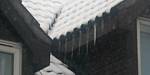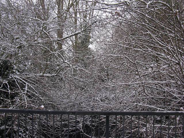 Bird tracks in the snow in an alleyway connecting Downage to Sunny Gardens Road. | Snow covered foliage. | Large icicles hanging from a roof. | Snow in Woodcock Park, Kenton. |