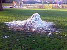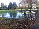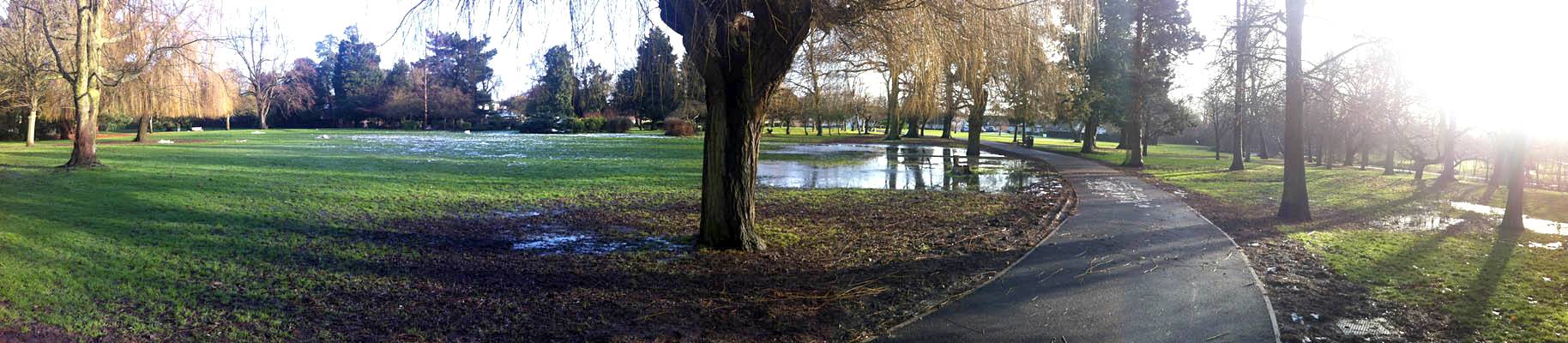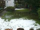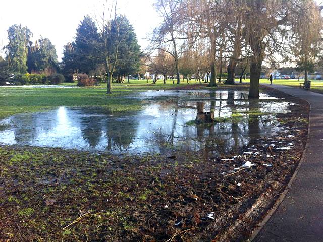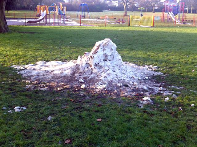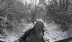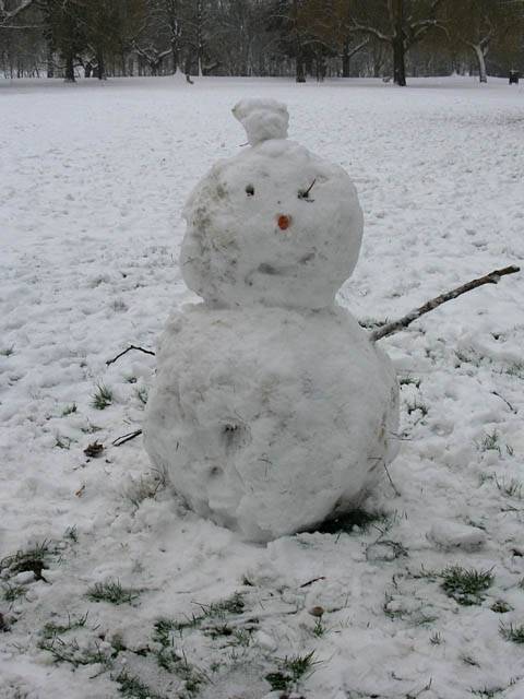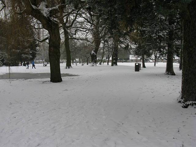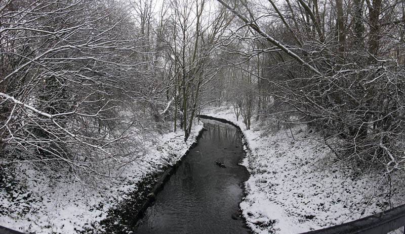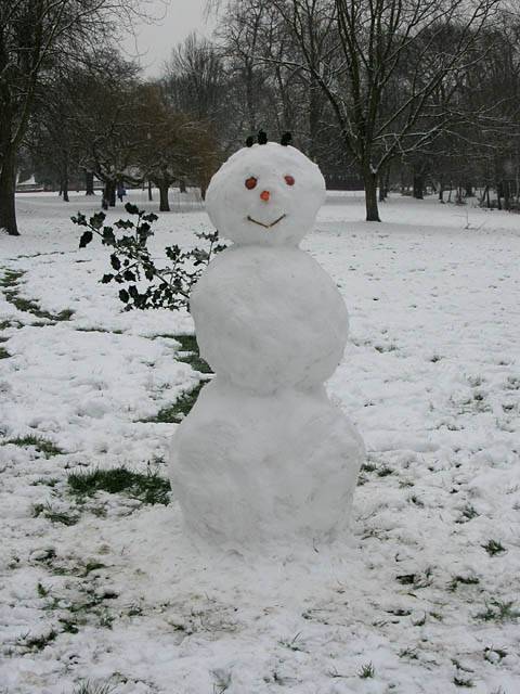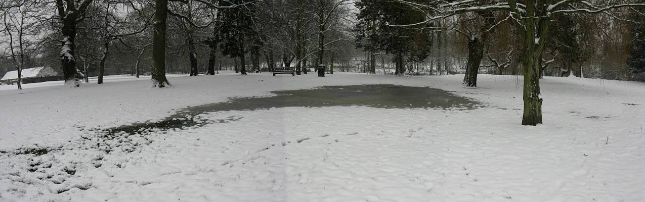 Semi-frozen flood water. | Path hidden under the snow. | Snow covered trees. | Big snowman. | Pictoresque scenes as I cross over Wealdstone Brook in Woodcock Park. |