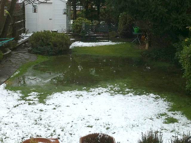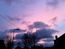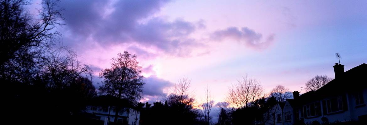 Hendon shower cloud lit up by sunset. | A mix of heavy rain the day before, turning to sleet and snow overnight led to the biggest flood ever in the garden. | Spectacular purple hued sunset in Kenton. | Sunset from a tube train between Wembley Park and Preston Road stations. | Mysterious post sunset scene in Kenton. |