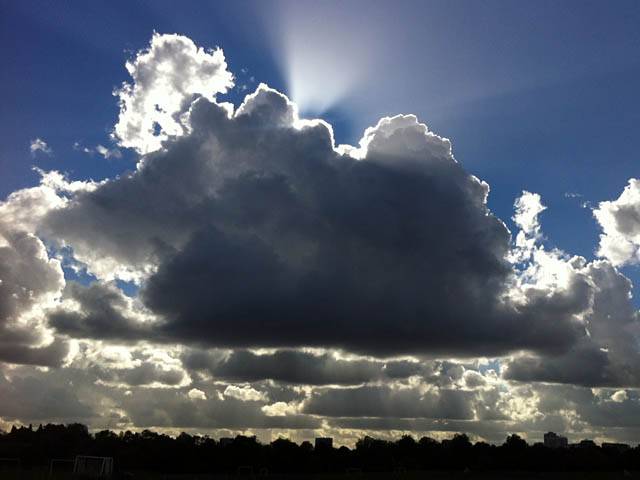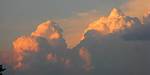 Kenton towering cumulus with the top lit up by the sunset. | Regents Park backlit cumulus and crepuscular rays. |